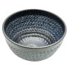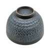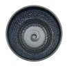 De kom heeft een mooie diepe ronde vorm. De traditionele manier van Mishima is een witte klei om gestempelde vormen te benadrukken. In deze matcha kom is gekozen voor een mooie blauwe bestempeling op donker aardewerk.