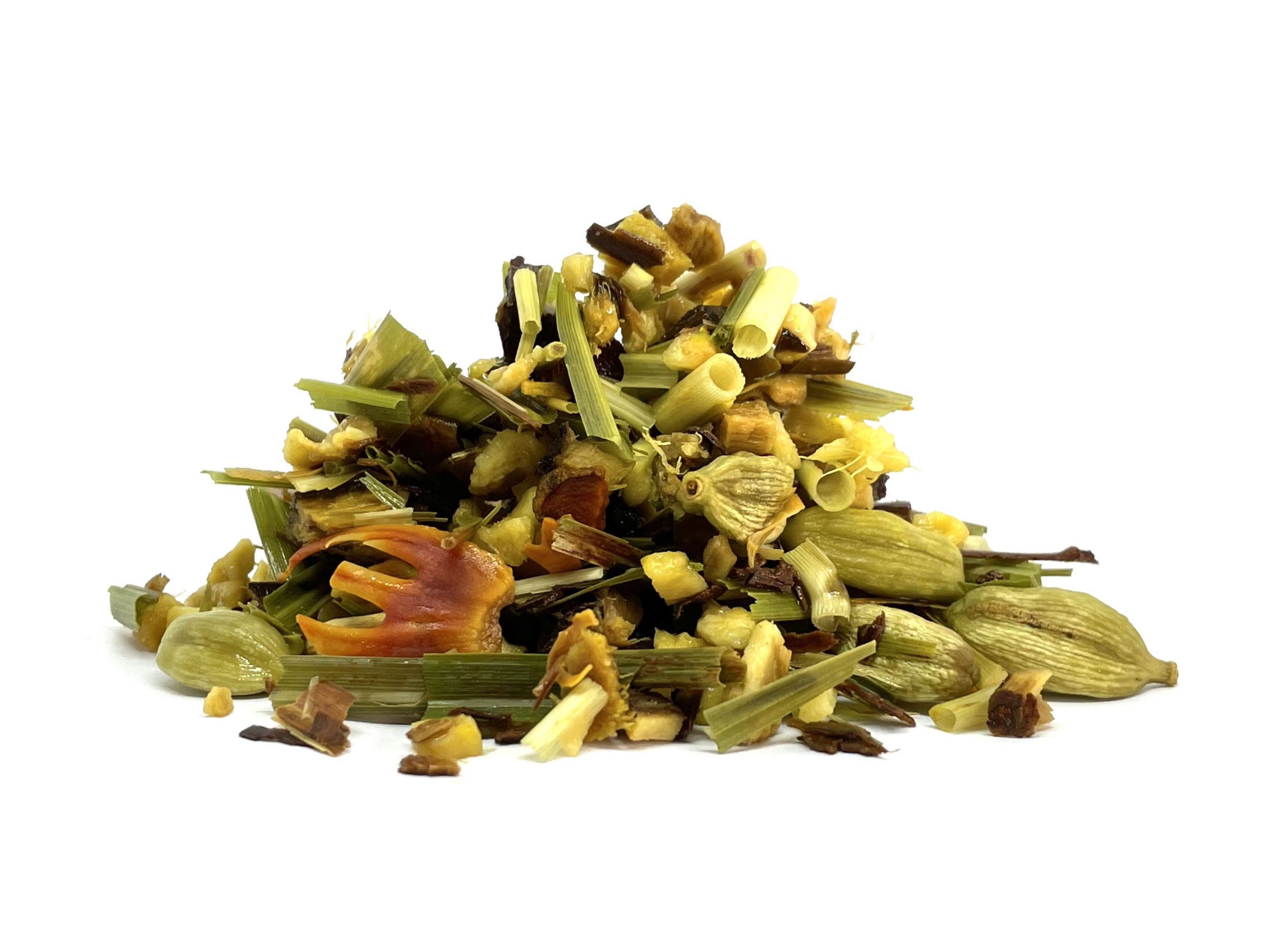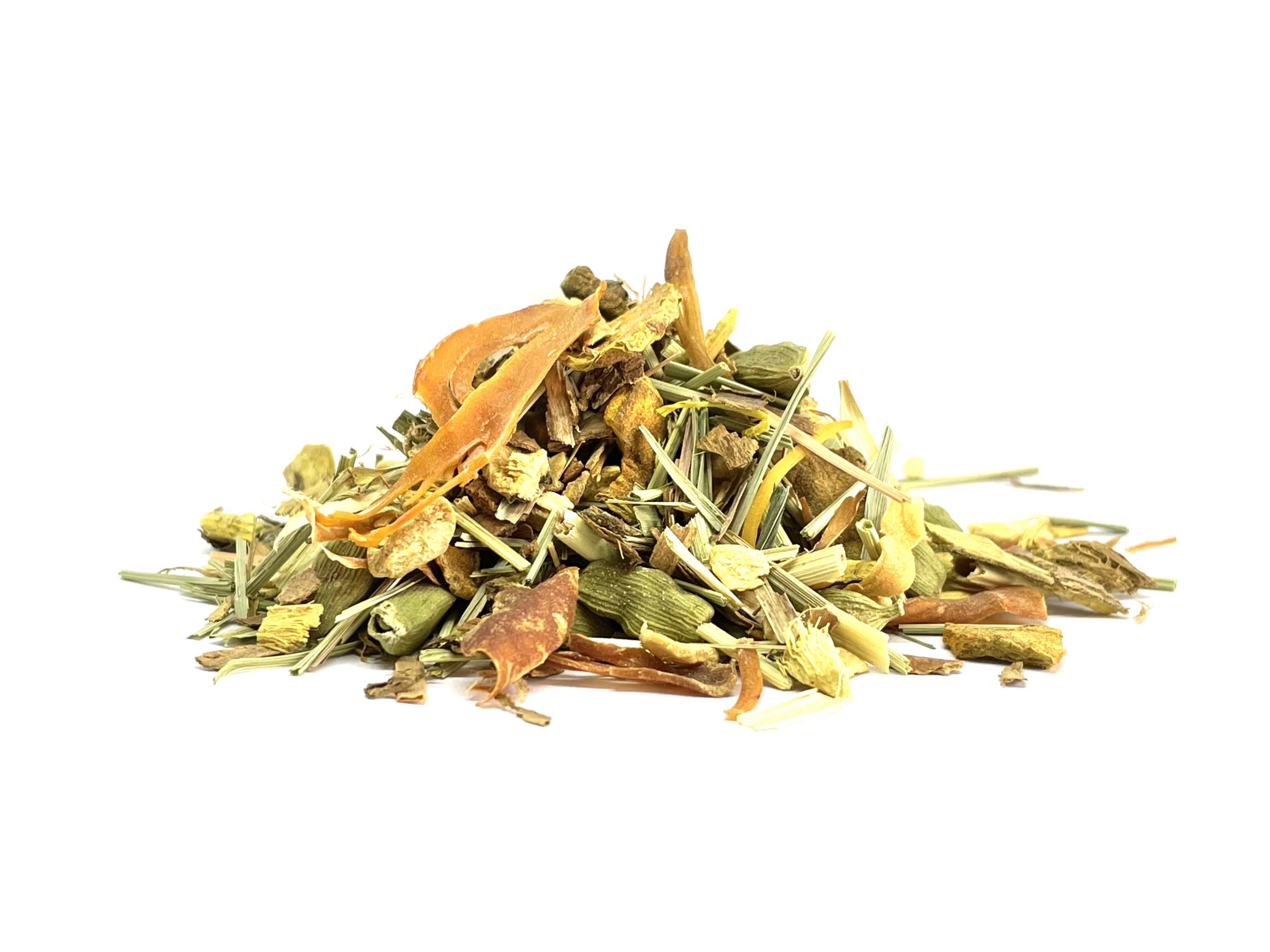 Bio ingrediënten: Gemberstukjes, zoethoutwortel, kaneel, citroengras, hele kardemom peulen, kurkuma, foelie